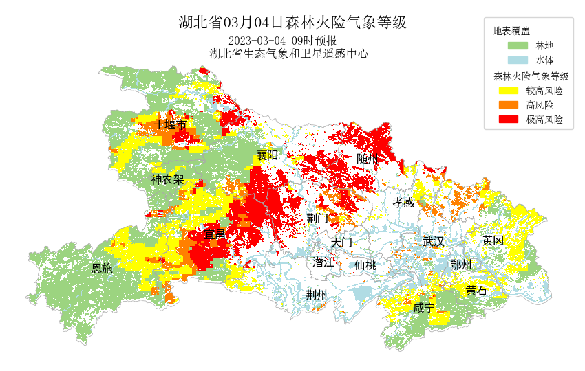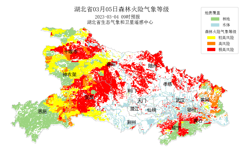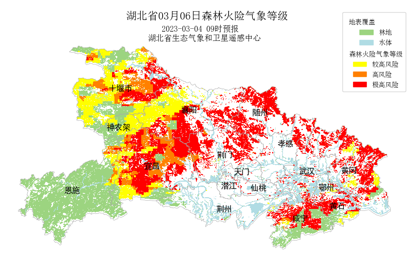 预计3月4日,鄂西北部分地区、鄂西南东部、江汉平原北部、鄂东北大部、鄂东南部分地区森林火险气象等级为较高以上风险,其中鄂西北北部及东部、鄂西南东部、江汉平原北部、鄂东北中西部为高到极高风险。5-6日森林火险范围特别是极高火险范围明显扩大。