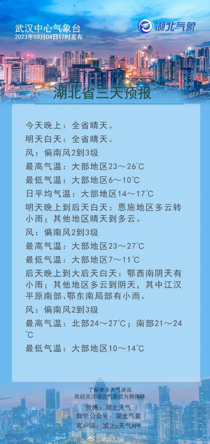 另据湖北省气象局最新预报,今明两天,我省大部地区天空晴朗,白天气温较高,中东部地区局部有霾。