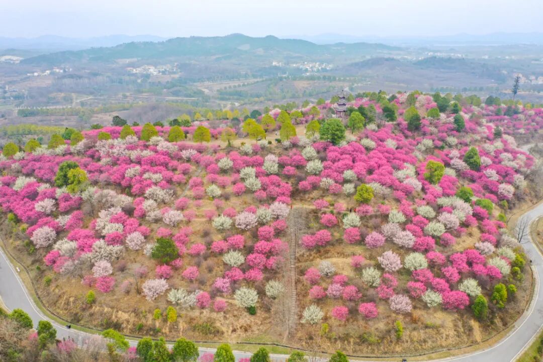 2月21日,在武汉市黄陂木兰花谷梅花林,300亩数十个品种的梅花正是盛花期,整个山坡姹紫嫣红美不胜收。(湖北日报全媒记者 倪娜 摄)
