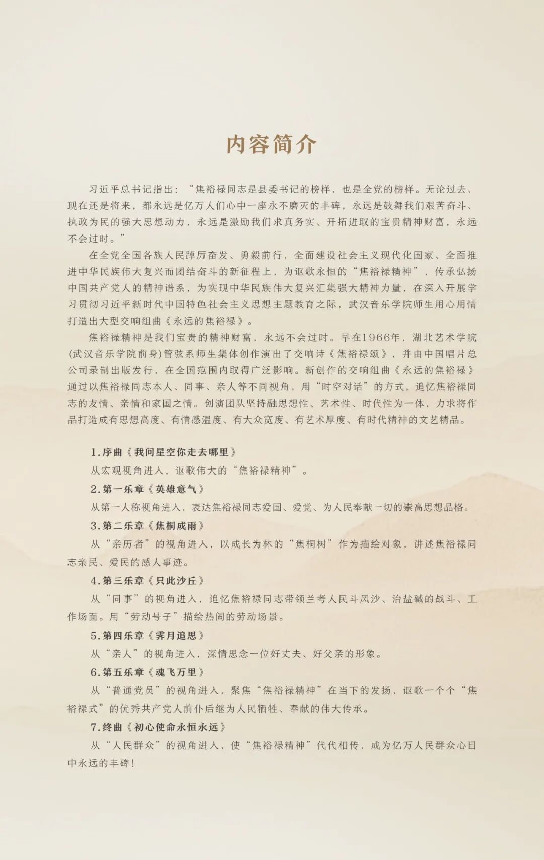在全党全国各族人民踔厉奋发、勇毅前行,全面建设社会主义现代化国家、全面推进中华民族伟大复兴而团结奋斗的新征程上,为讴歌永恒的“焦裕禄精神”,传承弘扬中国共产党人的精神谱系,为实现中华民族伟大复兴汇集强大精神力量,在深入开展学习贯彻习近平新时代中国特色社会主义思想主题教育之际,武汉音乐学院师生用心用情打造出大型交响组曲《永远的焦裕禄》。焦裕禄精神是我们宝贵的精神财富,永远不会过时。早在1966年,湖北艺术学院(武汉音乐学院前身)管弦系师生集体创作演出了交响诗《焦裕禄颂》,并由中国唱片总公司录制出版发行,在全国范围内取得广泛影响。新创作的交响组曲《永远的焦裕禄》通过以焦裕禄同志本人、同事、亲人等不同视角,用“时空对话”的方式,追忆焦裕禄同志的友情、亲情和家国之情。创演团队坚持融思想性、艺术性、时代性为一体,力求将作品打造成有思想高度、有情感温度、有大众宽度、有艺术厚度、有时代精神的文艺精品。
