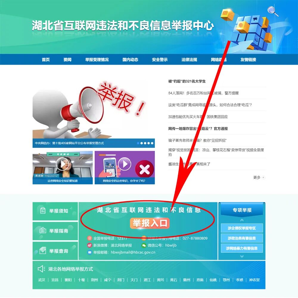 进入湖北省互联网违法和不良信息举报中心网站(http://hbjubao.cnhubei.com/),点击“举报入口”进行举报;
