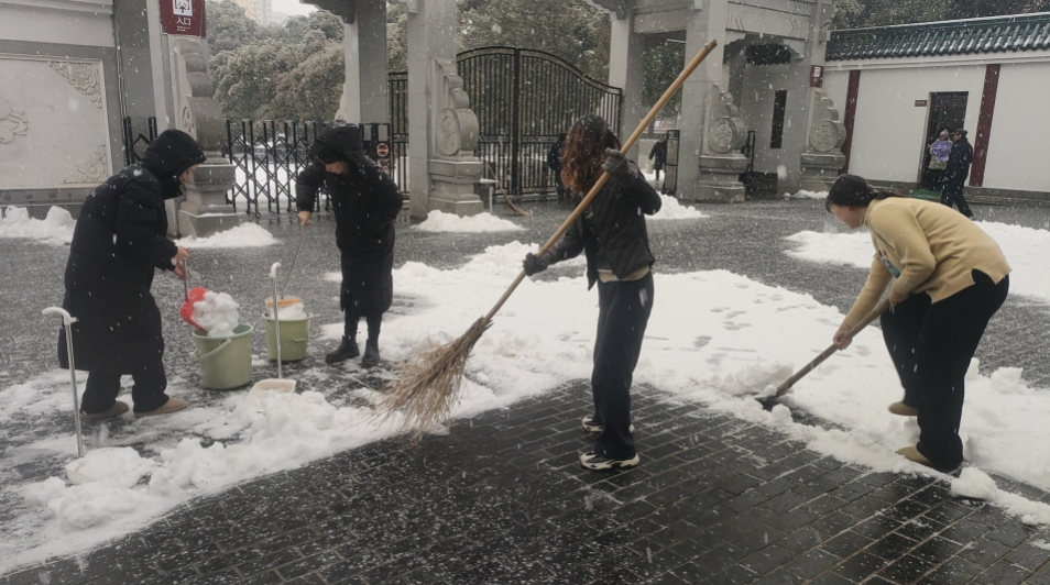 2月3日上午,黄麻纪念园各场馆工作人员不畏严寒,想尽各种办法做好路面防滑措施。他们干劲十足,用工具铲除路面积雪,为来园游客营造一个安全的参观环境。