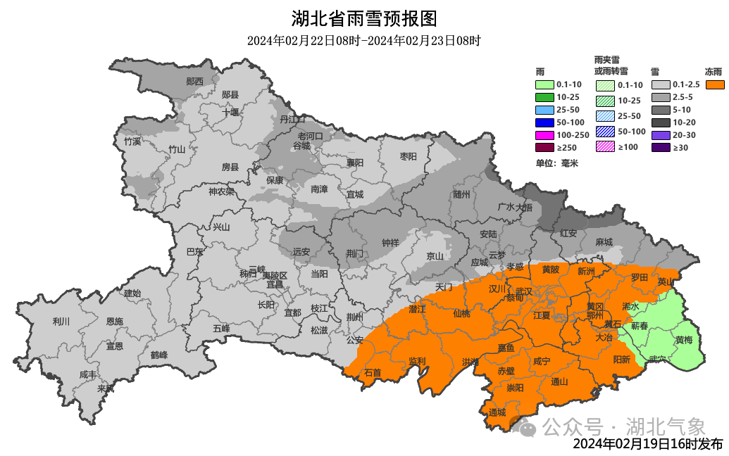 2月22日08时-23日08时:江汉平原东部、鄂东北东部、鄂东南阴天有冻雨;其他地区阴天有小到中雪,局部大雪。最高气温恩施地区1~4℃、其他地区-2~1℃,最低气温北部-6~-2℃、南部-2~1℃。偏北风3到5级、阵风6到8级。