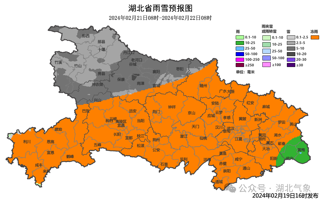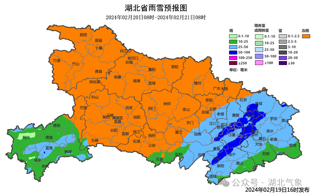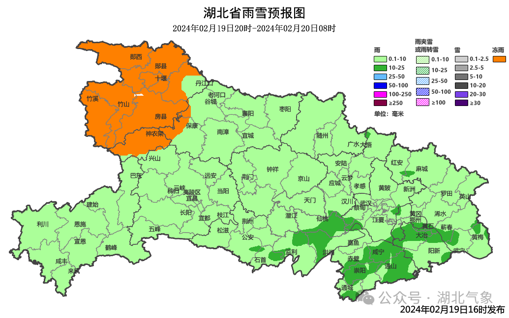 2月20日08时-21日08时:鄂西北北部冻雨转中到大雪,局部暴雪;鄂西北南部、鄂西南北部、江汉平原、鄂东北西部中雨转冻雨或冰粒;其他地区阴天有中到大雨,局部暴雨并伴有短时强降水、雷暴大风、冰雹等强对流天气。最高气温北部2~6℃、南部7~10℃,最低气温北部-4~0℃、南部1~5℃。偏北风4到6级、阵风7到10级。