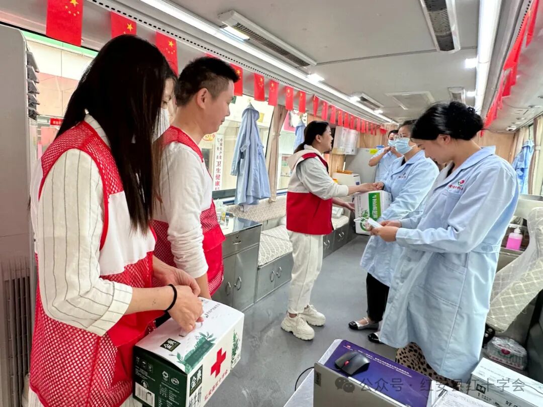 活动现场,红安县红十字会负责人一行到县民主街卫健局门口流动采血车、县建筑街中医院后门爱心献血屋慰问黄冈市中心血站医务工作人员,并送上牛奶、金银花露等降温物资。
