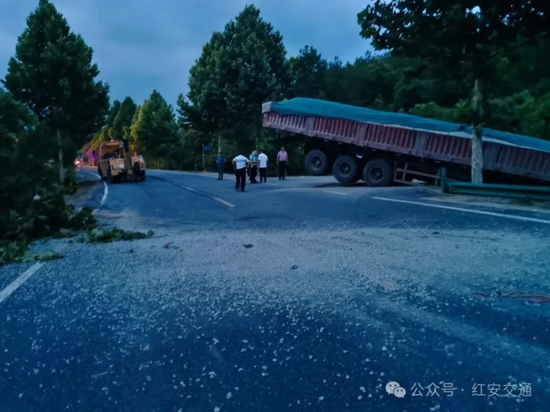 红安网消息 6月6日晚7:00,红安公路部门接到交通执法大队电话,在福阳线K51十700处一辆大型平板货车因紧急避让其他车辆,导致大货车侧翻公路旁,大量沙石料撒落路面,给过往车辆造成一定安全隐患。