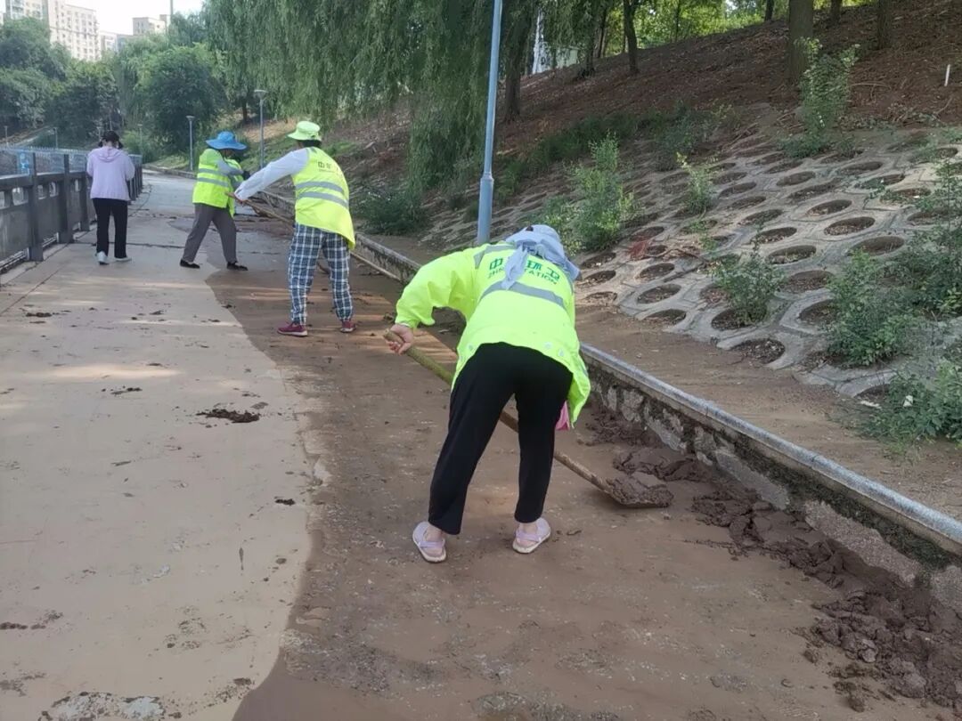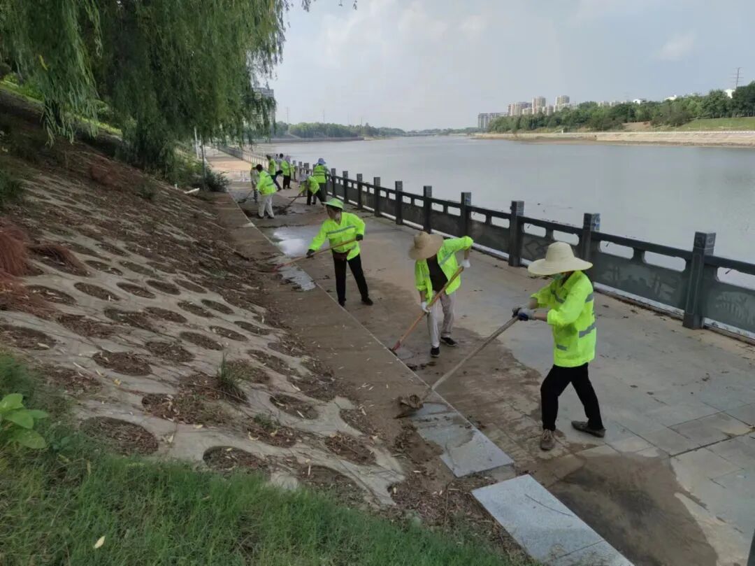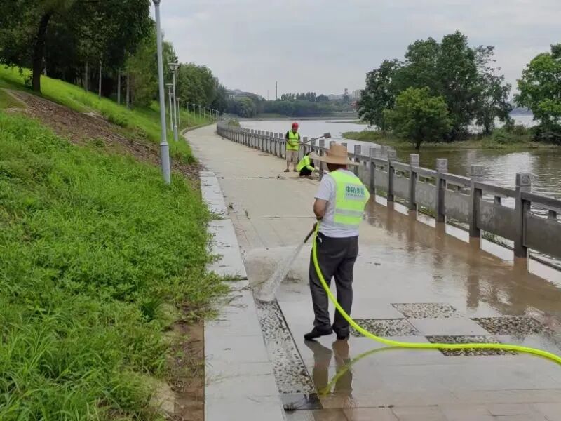 为保障汛后市民出行安全,最大程度减少强降雨天气对城市环境卫生的影响,县城管执法局组织中航公司人员设备,对一河两岸亲水平台淤积泥沙进行集中清理和冲洗。