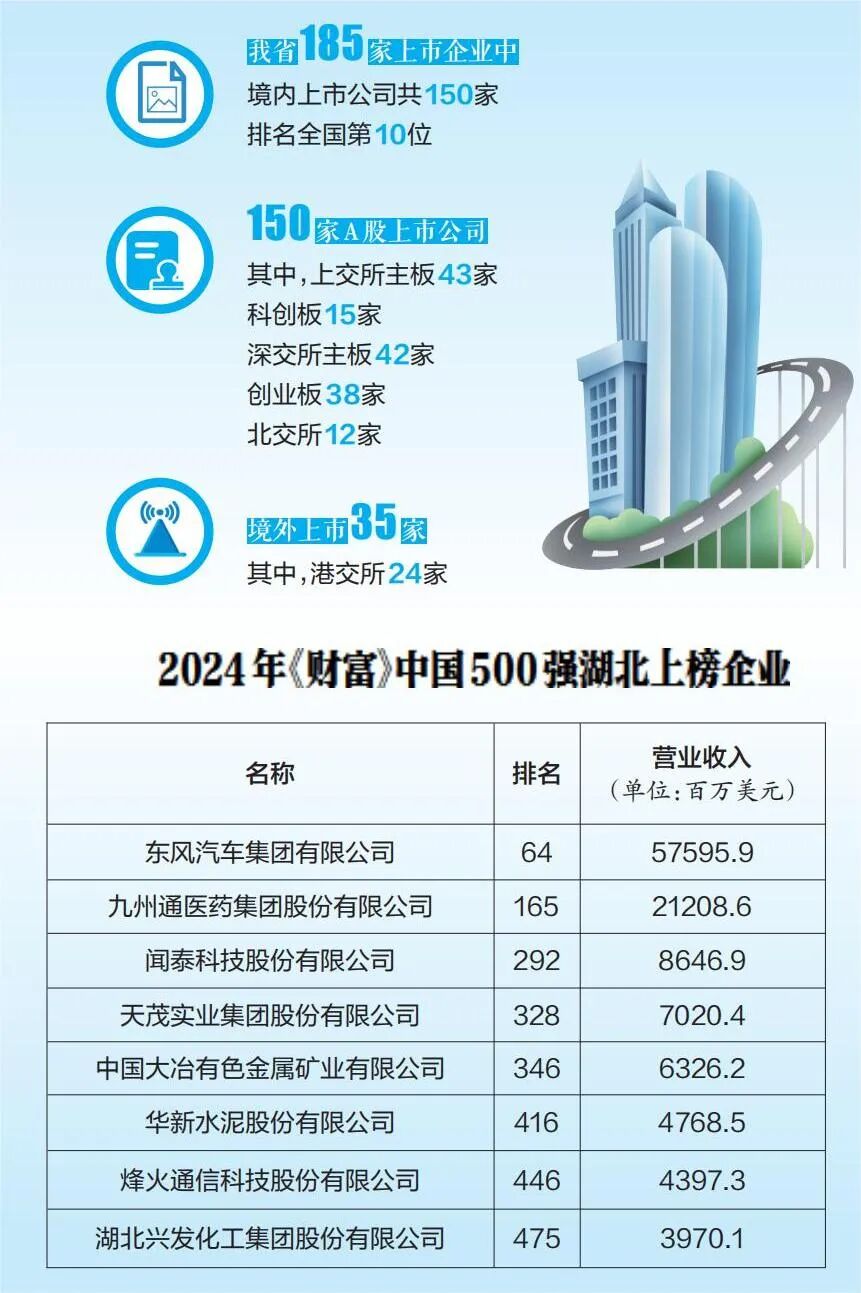 这些行业中,涌现出不少龙头企业。7月25日,2024年《财富》中国500强排行榜发布,8家湖北企业上榜,东风汽车、九州通、闻泰科技、天茂实业、大冶有色、华新水泥、烽火通信、兴发集团均为上市企业。2018年上市的长飞光纤,已成长为全球最大的光纤预制棒、光纤和光缆供应商,产品销往90多个国家和地区。医药生物行业,九州通已在全国设立了31个省级、110个地市级物流中心,营销网络覆盖全国96%以上的行政区域。作为中国建材行业“走出去”的先行者,华新水泥的国际业务目前覆盖海外16个国家。