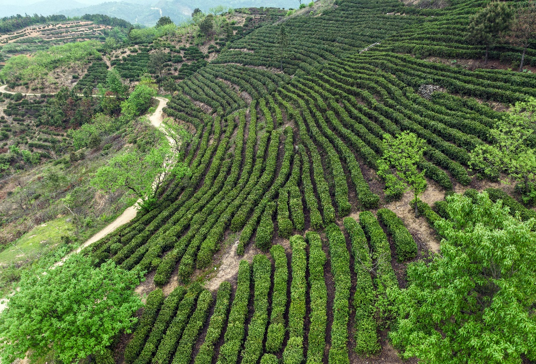 盛夏时节,海拔163米的红安县小君山上连片的茶园格外青翠。茶树丛中,秦湾村党支部书记秦泽稳正在和村民们一起拔草、施肥。远眺一垄垄茶田,秦泽稳欣喜地告诉记者,这片荒山添新绿的茶园已成为秦湾人的“金叶子”。