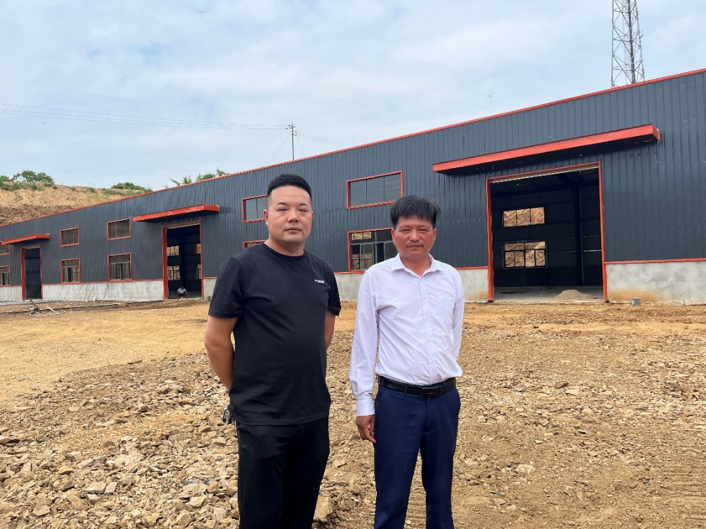 秦泽稳与湖北岭康中药材公司付其春(右一)在新建中药材加工车间
