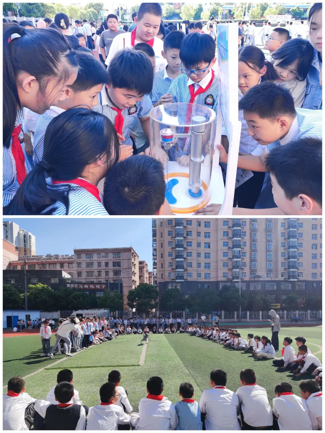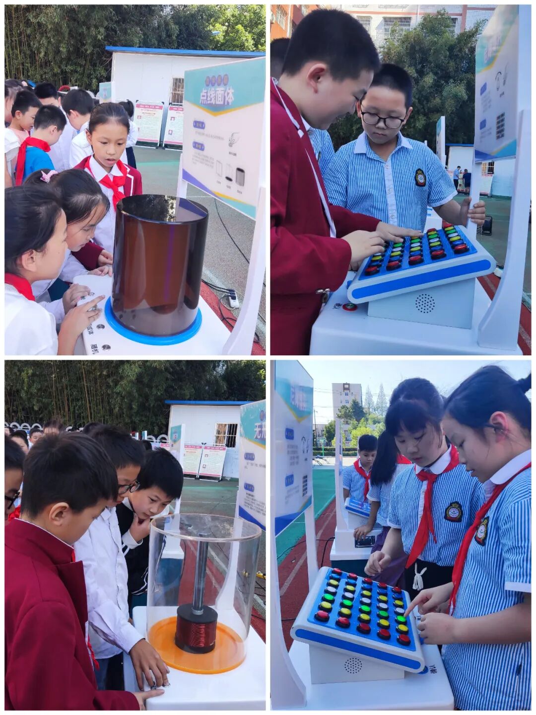 操场上,科普大篷车为孩子们带来了等速螺线、窥视无穷、杨辉三角、神奇的方孔钻、双曲线槽、点线面体、无形的力、神秘的磁力、机械狗等趣味丰富的科普展品。在老师的引导下,他们积极动手尝试和亲身体验,沉浸式了解了电学、光学、机械学等科学知识及其蕴涵的科技奥秘。