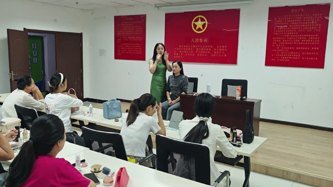 在红安县青年之家旗舰店,刘润菲老师的美妆课拉开了帷幕。老师首先为大家讲解了正确的护肤和化妆步骤,并对化妆品的种类、化妆工具等进行了细致讲解,分享了皮肤清理、保养的各种小技巧。为了让学员们更直观地感受妆容变化的效果,刘润菲老师邀请几名学员上前作为模特,进行化妆技巧教学示范,加强了大家对化妆手法的理解。学员刘蒙说:“一直想好好学一下化妆技术,一看到青年夜校开设美妆课我就马上报名了。授课老师十分专业,今天收获感满满!”