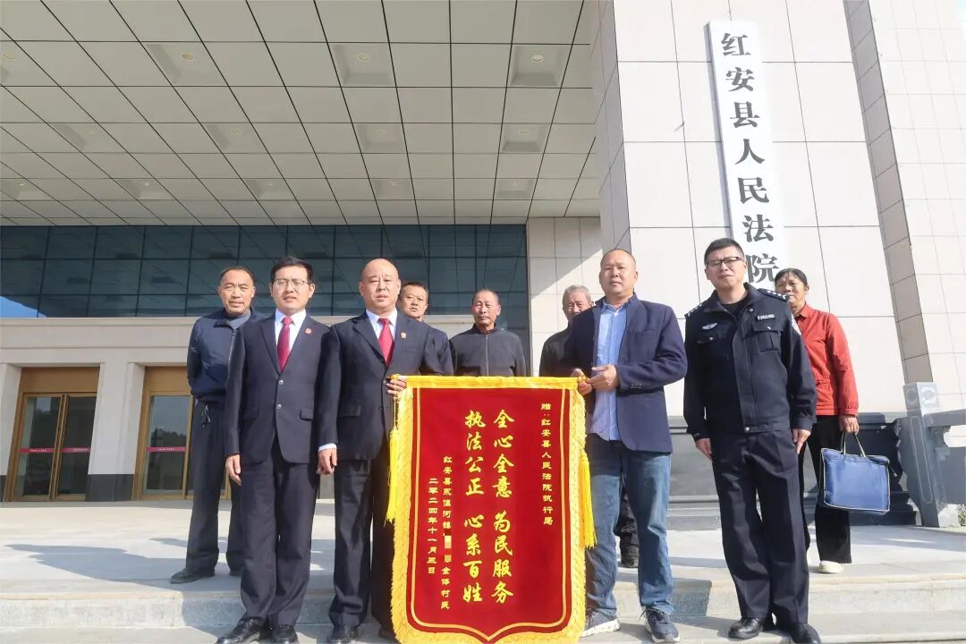 “村民的事有了着落,土地也没有浪费,事情终于圆满解决,感谢你们的辛苦付出!”在拿到执行款后,该村部分村民来到红安县人民法院,代表全体村民向执行局干警赠锦旗表达感谢。