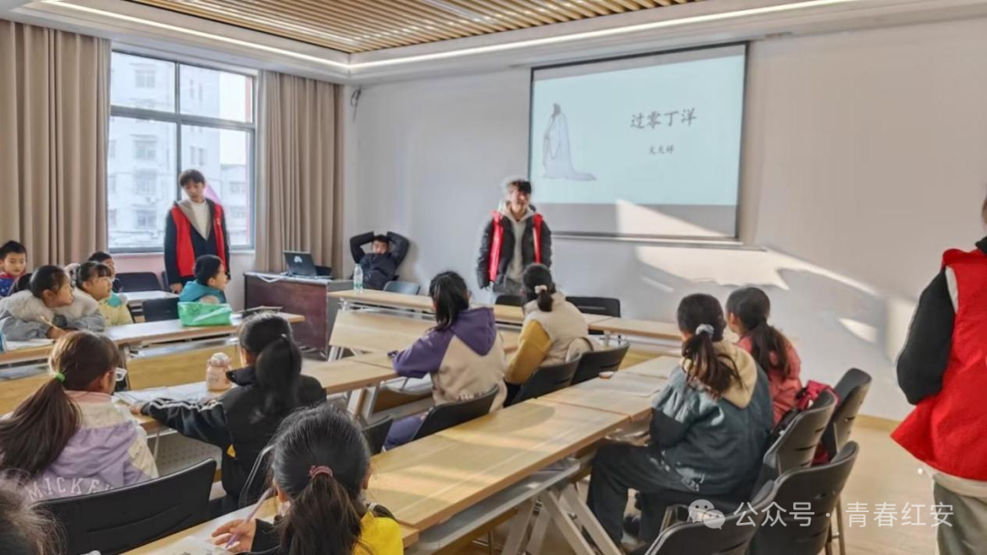 在觅儿寺镇老年大学,武汉城市学院城建学部的志愿者团队,为凉亭社区的小朋友们带来了诗词赏析、课业辅导、益智游戏小课堂。二十余位小朋友热情参与,在国学经典《过零丁洋》中,感受了文天祥的忠诚与爱国情怀;在益智小游戏中,锻炼思维能力和动手操作能力;在作业辅导中查漏补缺、温故而知新。