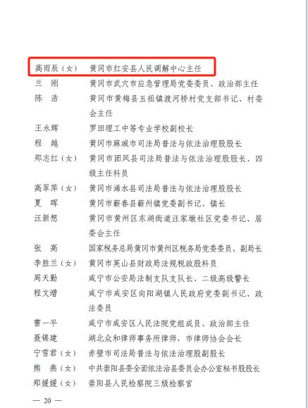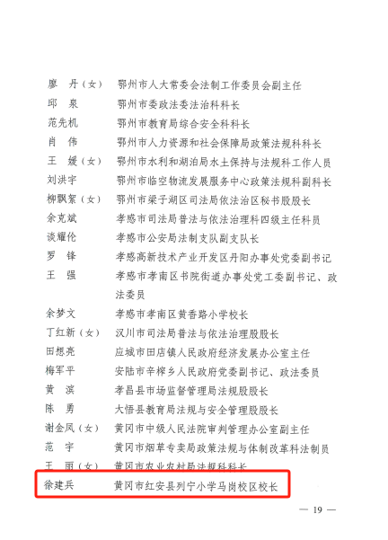 我县有1个单位和2名个人受到通报表扬,其中红安县市场监督管理局荣获全省“八五”普法中期表现突出单位,红安县列宁小学马岗校区校长徐建兵、红安县人民调解中心主任高雨辰荣获全省“八五”普法中期表现突出个人。