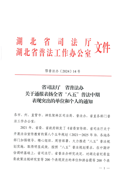 红安网消息 近日,湖北省司法厅、省普法办印发《关于通报全省“八五”普法中期表现突出的单位和个人的通知》,红安县1个单位和2名个人上榜。