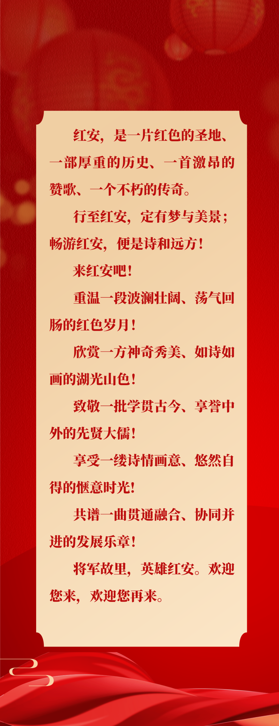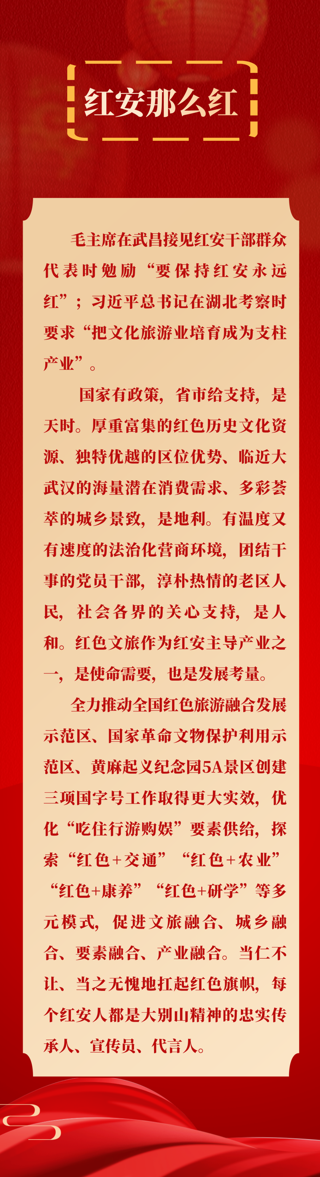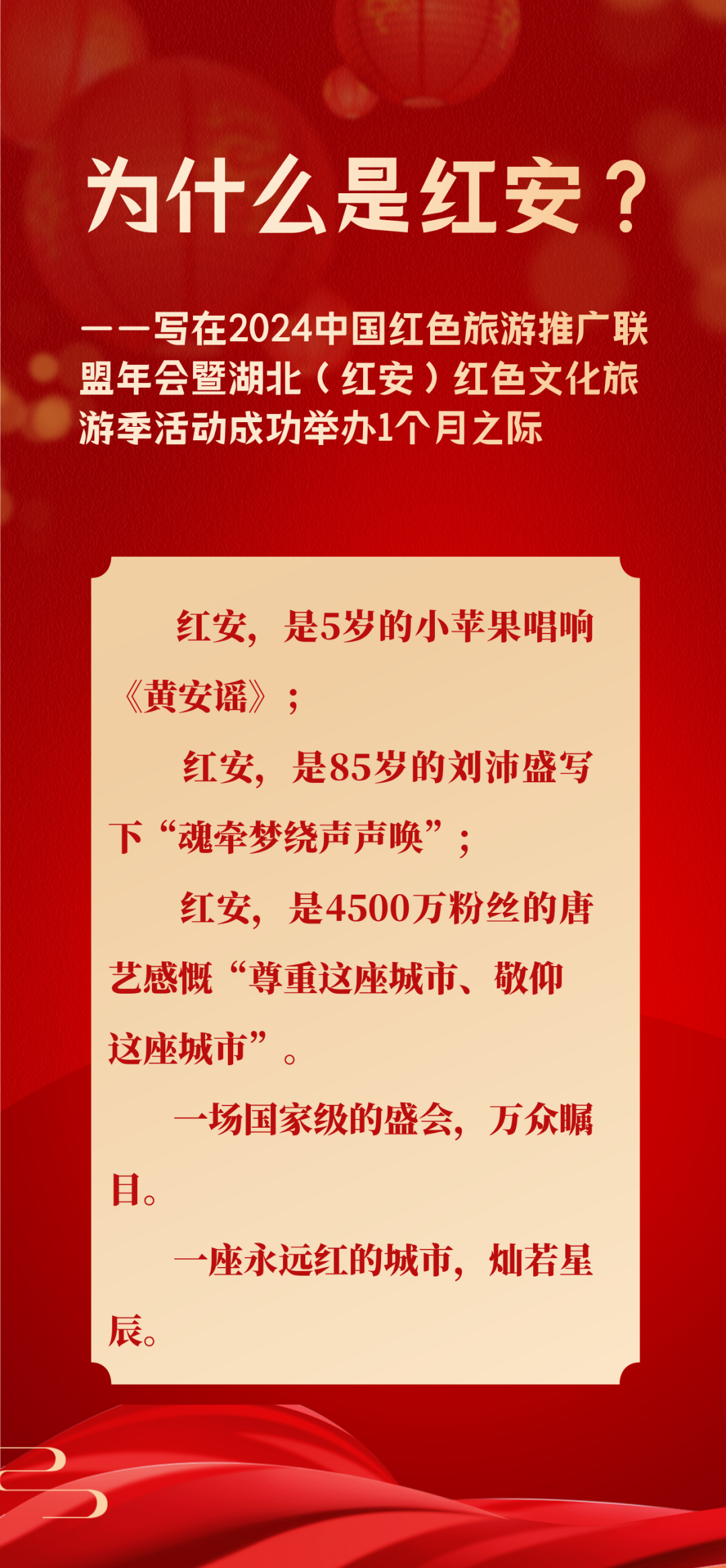编前 2024年11月12日—15日,红安成功承办了2024中国红色旅游推广联盟年会暨湖北(红安)红色文化旅游季活动,向全国人民展现了红安厚重富集的红色文化底蕴、稳中有进的发展态势、昂扬向上的精神风貌,既“出圈”又“出彩”。