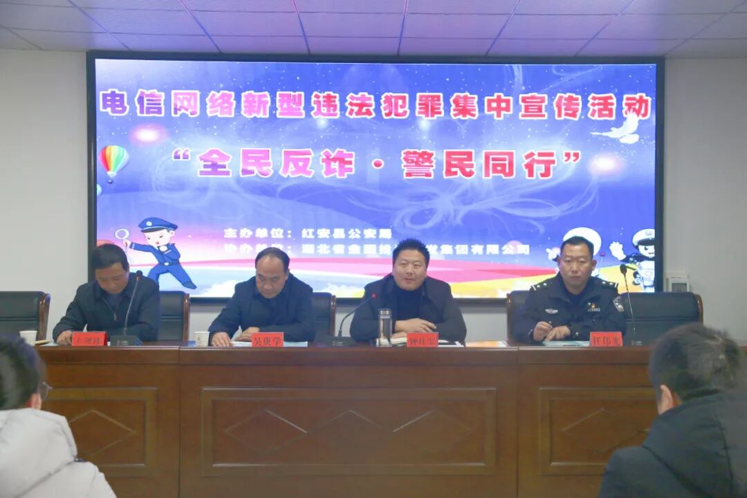 1月18日上午,湖北省金圆投资开发集团有限公司三楼会议室热闹非凡,一场别开生面的反诈宣传活动在此举行。本次活动由红安县公安局联合湖北省金圆投资开发集团有限公司共同举办,旨在进一步提升企业防范电信网络诈骗的意识与能力,营造安全稳定的营商环境,切实守护好群众的“钱袋子”。公安局、圆投公司相关负责人,圆投公司部分员工以及公安局部分民辅警代表共70余人参加活动。