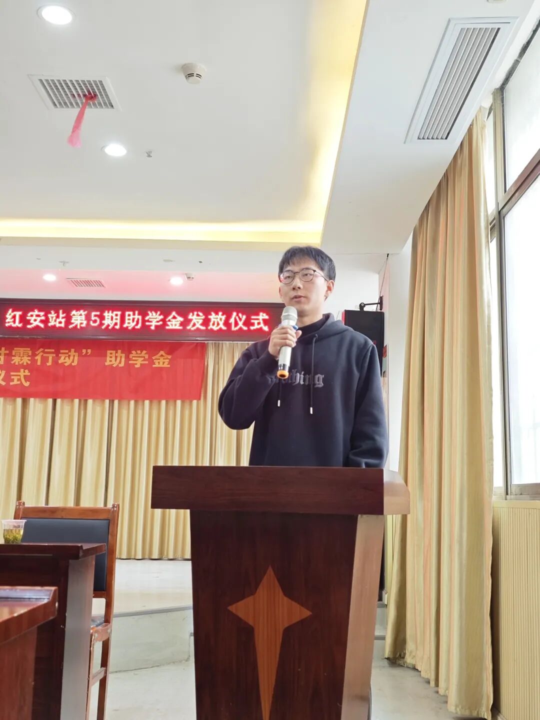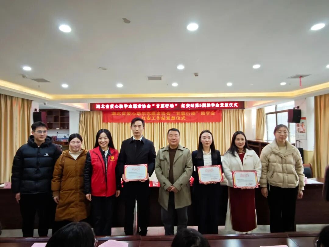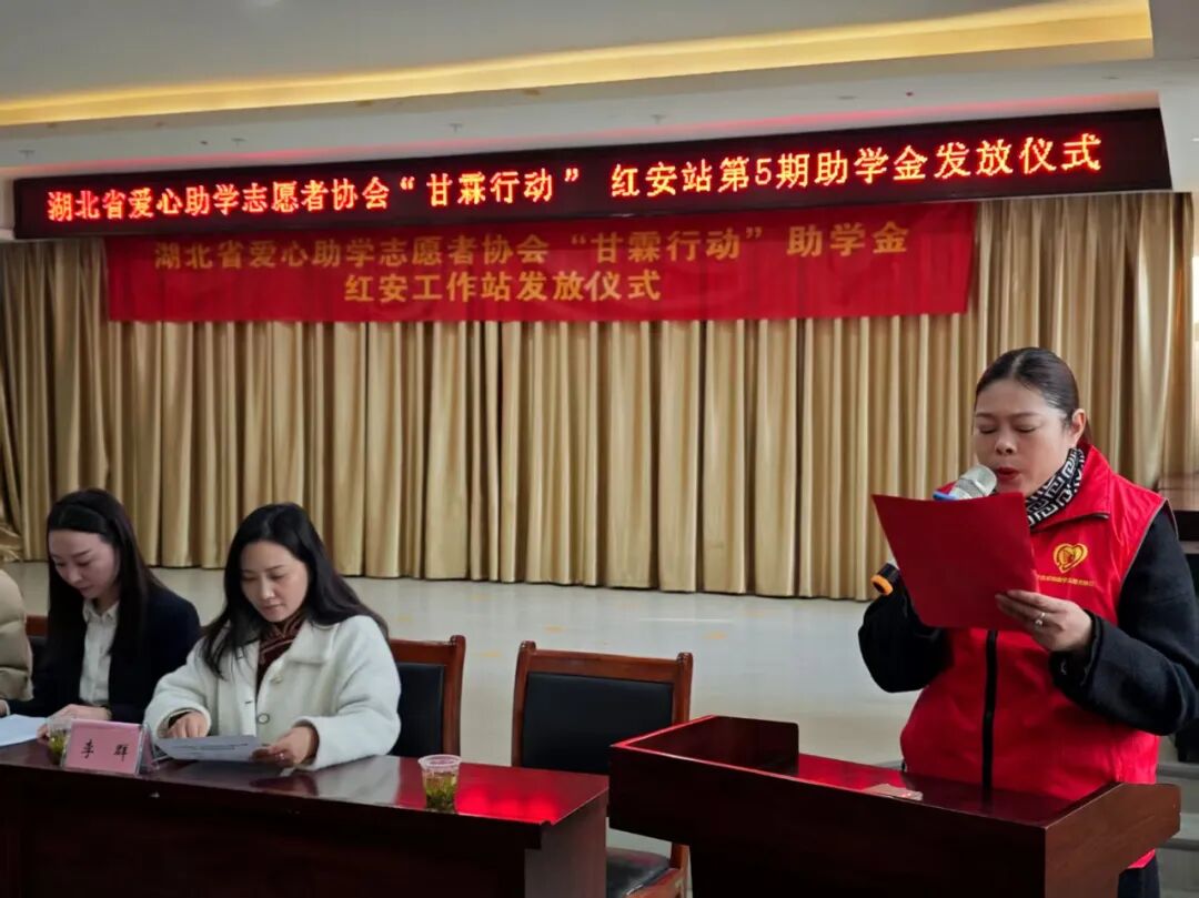红安网消息 1月19日下午,湖北省爱心助学志愿者协会“甘霖行动”红安站第五期助学金发放活动在土井社区会议室举行。团县委、县教育局、红安县志愿者协会等有关单位负责同志,爱心企业家代表,大学生志愿者,受资助学生,家长代表100余人参加。活动由团县委书记王哲主持,湖北省爱心助学志愿者协会会长吴莺出席活动并讲话。