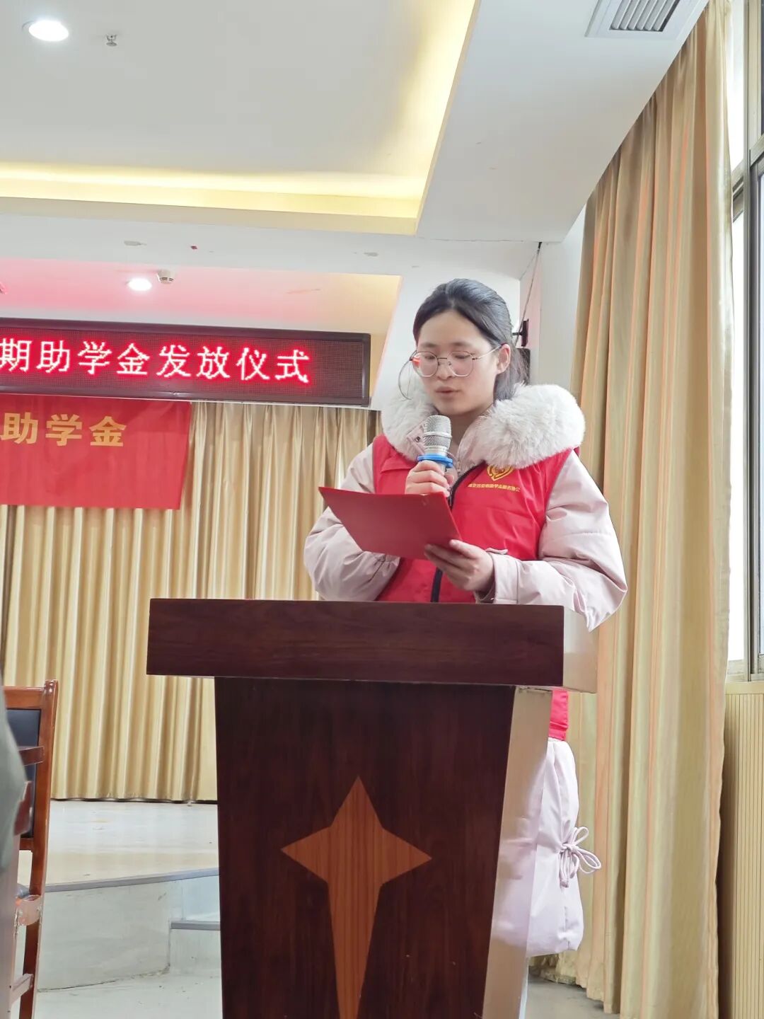 与会领导为学生发放助学金、暖心物资