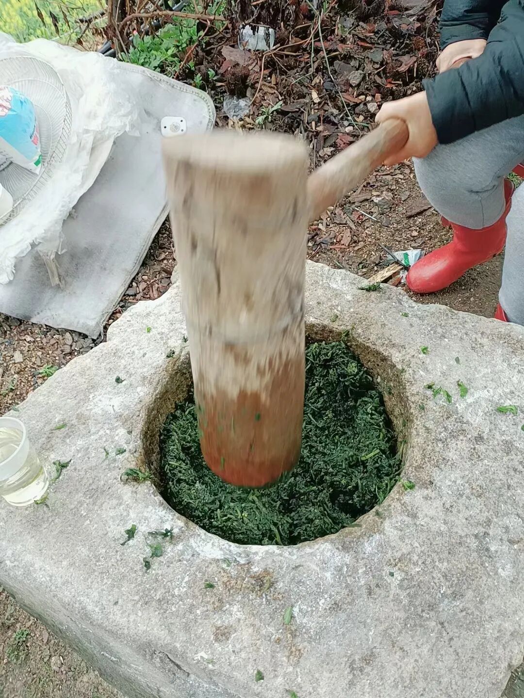 把软萩草带回家后,母亲便开始忙碌起来。她先去洗米,再到生产队仓库门前的石臼舂大米粉和糯米粉,准备做软萩粑。母亲做软萩粑很有讲究,她会把鲜嫩的软萩草洗净、沥干水分,然后用石臼舂碎,捣成泥状。接着,按照2:1:1的重量比例,将舂好的大米粉、糯米粉和软萩泥混合在一起,这可是老家村民总结出的经验,这样做出的软萩粑软糯可口、香气四溢。