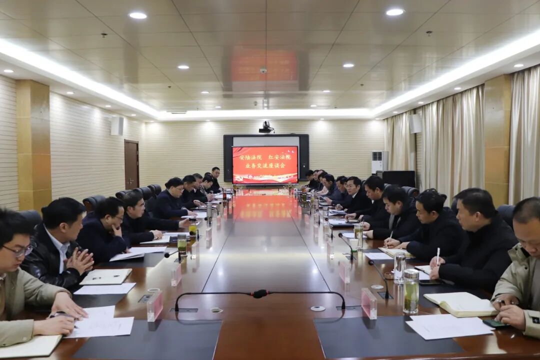 红安网消息 2月20日,安陆市人大常委会副主任池青峰、安陆市法院党组书记、院长彭红杰一行到红安法院考察交流破产审判工作。县人大常委会党组副书记王辉军、县政协副主席秦觉飞、县法院院长卢绘,县委政法委、县税务局、自规局领导及黄冈两级法院法官代表参加座谈。