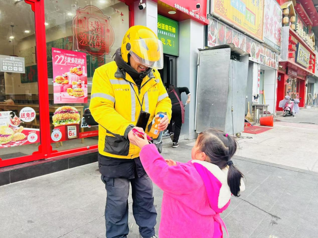 大二班的孩子们走到巡特警街面执勤点,手持自制的精美手工作品,用稚嫩的声音说道:“警察叔叔辛苦了!”