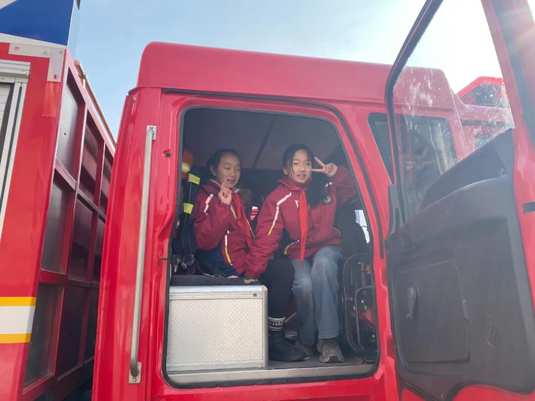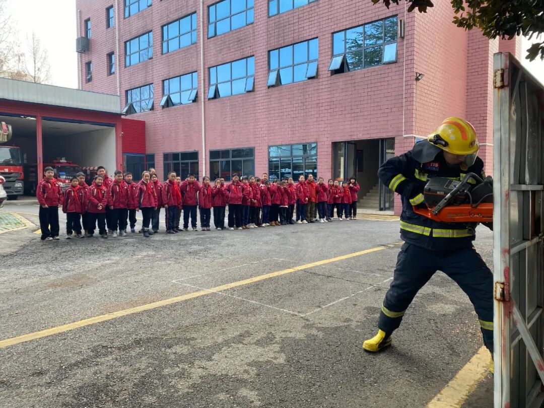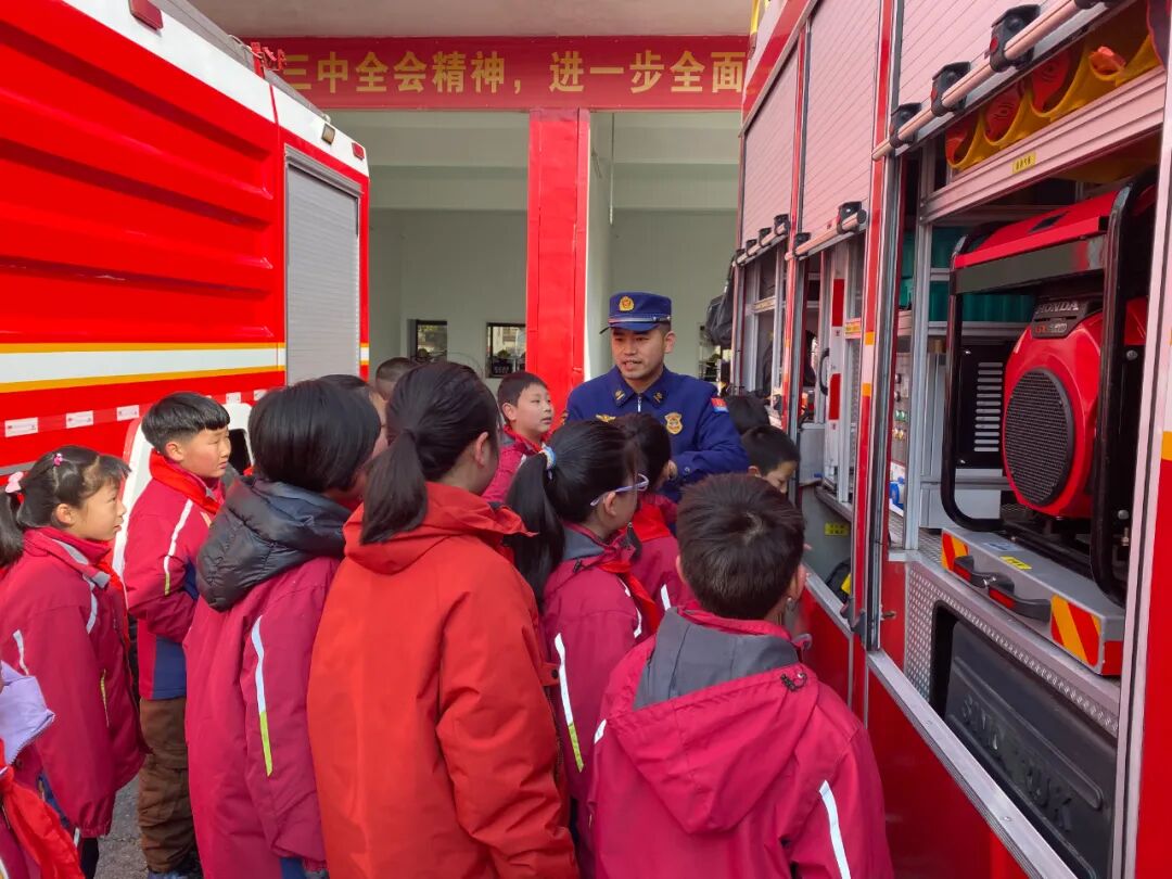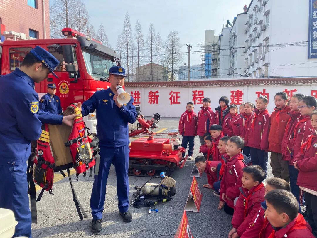 在红安县少先队校外实践基地——红安县消防救援大队,校外辅导员带领少先队员认识应急救援设备,学习消防安全知识,观摩应急救援演练。