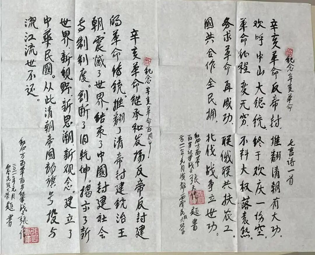 此次接收的12件张天伟个人档案包括:中央党校教材《作文讲话略稿》、张天伟赠张蜀生的手抄《毛泽东论思想方法问题记录稿》及纪念辛亥革命100周年题字、题诗等。这些珍贵档案是研究红安精神和传承红色基因的宝贵财富,它们将作为红色基因的载体,继续讲述革命年代的峥嵘故事。