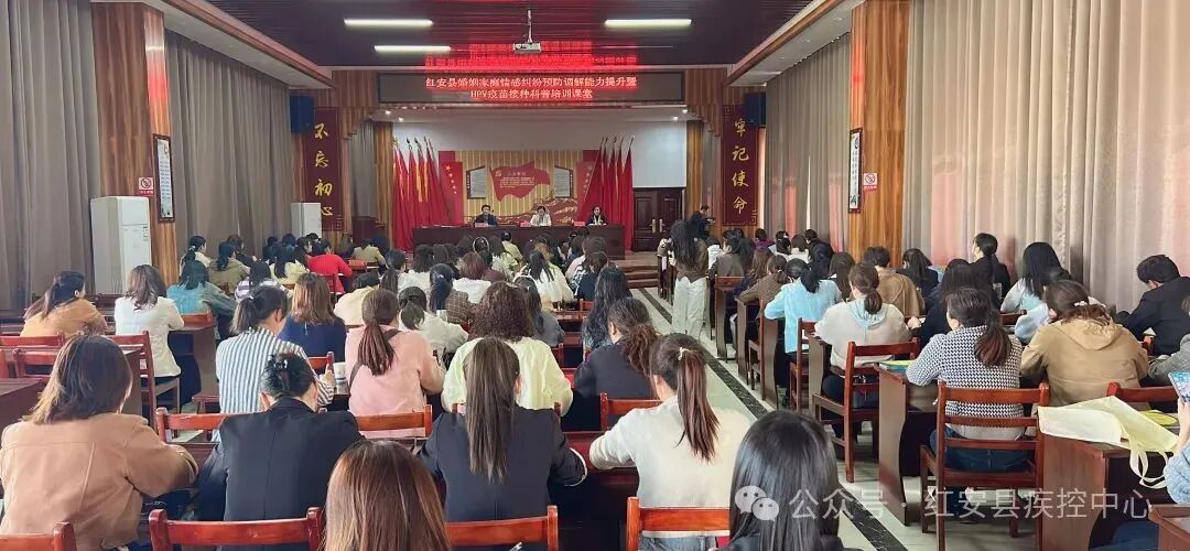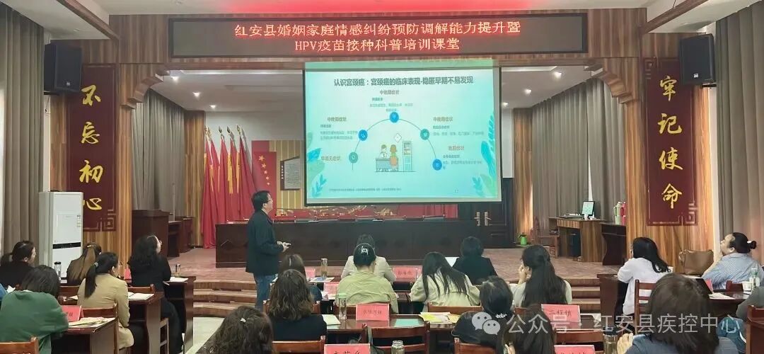 红安网消息 为深化平安家庭建设,推进消除宫颈癌工作,提升女性健康防护意识,4月14日上午,红安县妇联联合县疾控中心在城关镇王家畈社区服务中心举办“守护家庭幸福 共筑健康防线”—红安县婚姻家庭情感纠纷预防调解能力提升暨HPV疫苗接种科普培训课堂。全县各乡镇(场、处)妇联主席、专职副主席、城关镇、杏花乡各村(社区)妇联主席及王家畈社区巾帼志愿者、妇女群众等100余名代表参加课堂活动。