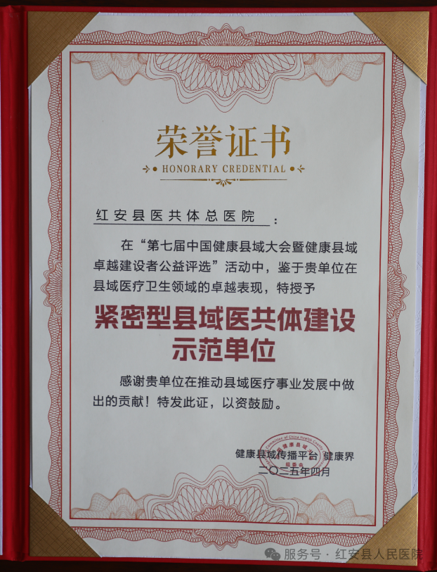 红安网消息 4月27日,中国医药卫生文化协会、《中国农村卫生事业管理》杂志、健康界、健康县域传播平台、上海交通大学健康长三角研究院及博鳌创新研究院于2025年4月25日-27日在北京联合主办荣获“第七届中国健康县域大会暨2025县域医共体人工智能生态建设大会”,近千家县域基层医疗机构参加,红安医共体总医院(红安县人民医院)脱颖而出,荣获“紧密型县域医共体建设示范奖”。