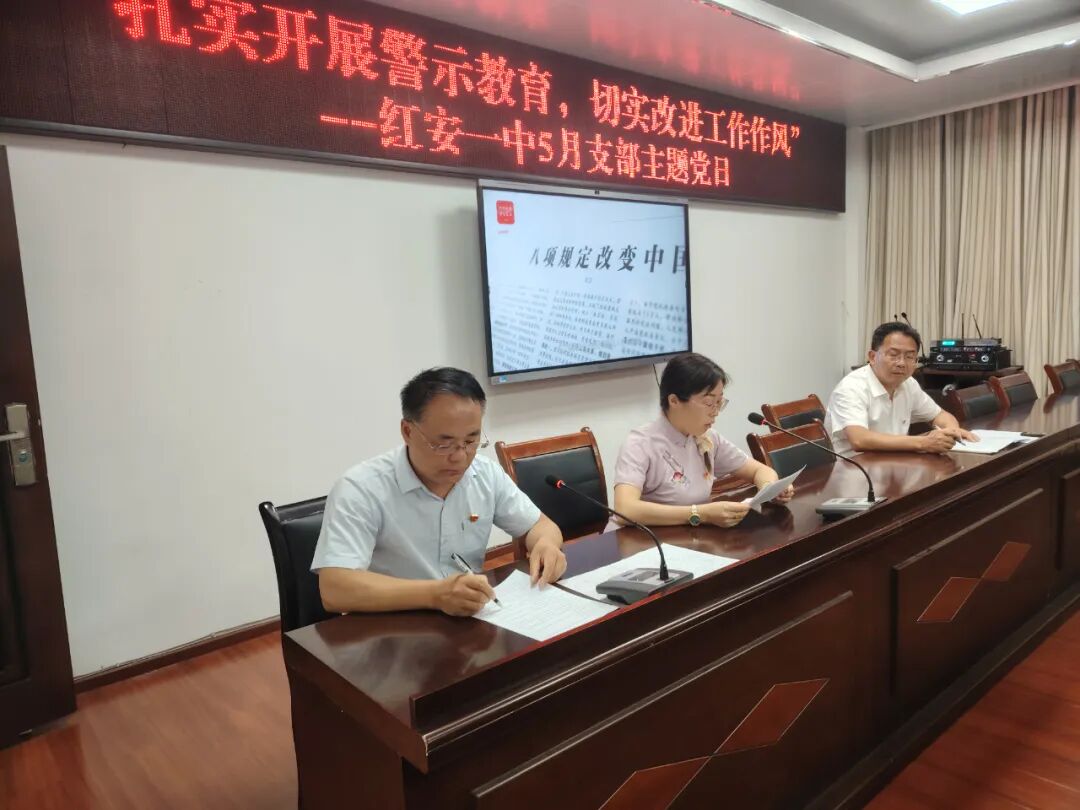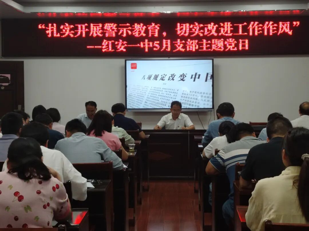 红安网消息 5月12日,红安县第一中学以“扎实开展警示教育 切实改进工作作风”为主题,组织开展5月份支部主题党日活动,学校全体党委成员、党员教师参加活动。此次活动由生物学科党支部书记杜海波主持,通过集中学习、交流分享、主题党课等环节,推动党员干部筑牢思想防线、强化使命担当。