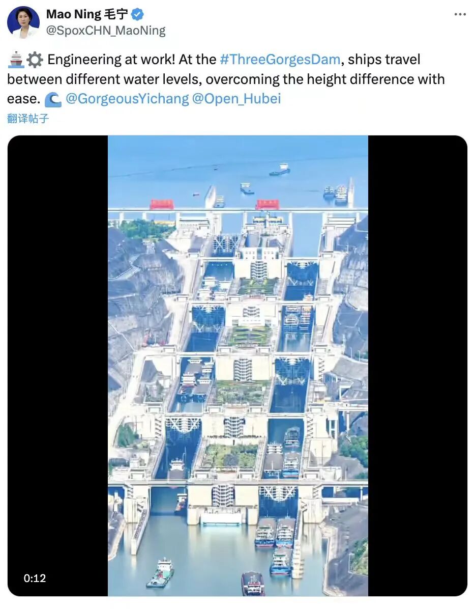 5月20日外交部发言人毛宁发布了三峡双线五级船闸的视频