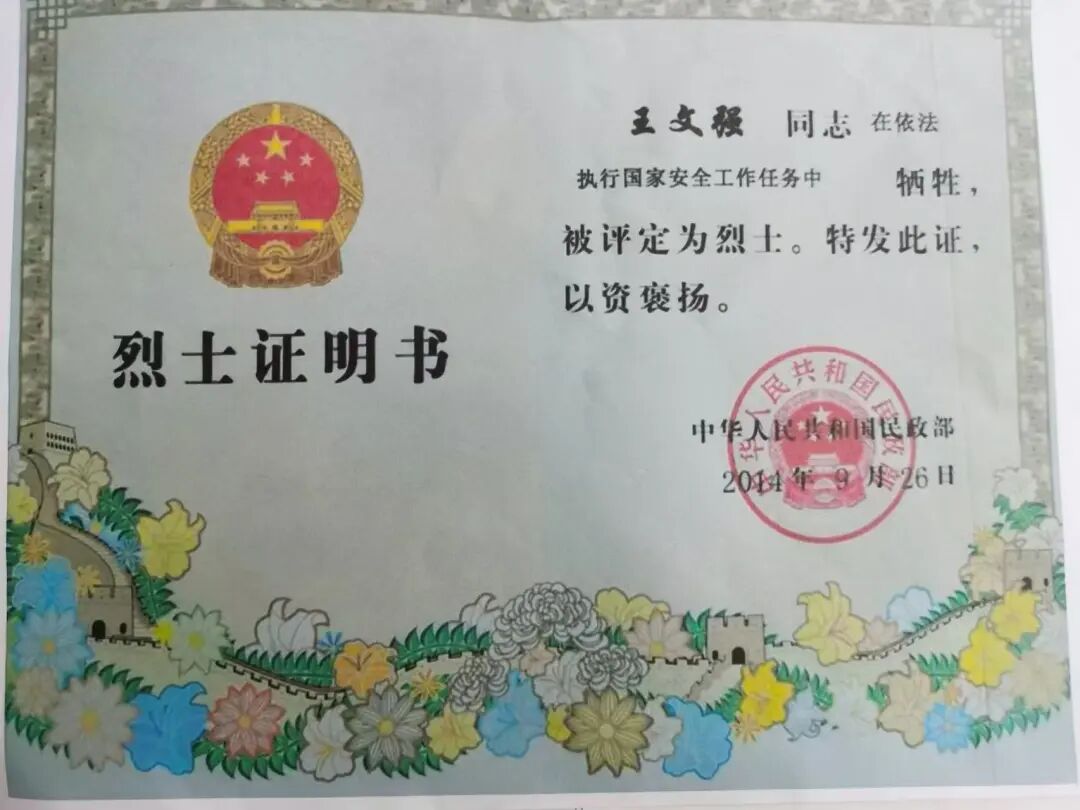 王文强同志的烈士证明书