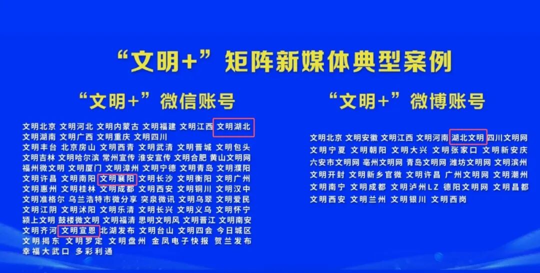 在10日举行的党的创新理论网上传播分论坛上,中国精神文明网发布“文明+”矩阵新媒体典型案例,并现场展示了100家“文明+”矩阵新媒体典型案例账号,"文明湖北""文明襄阳""文明宣恩"入选“文明+”微信账号,"湖北文明"入选“文明+”微博账号。