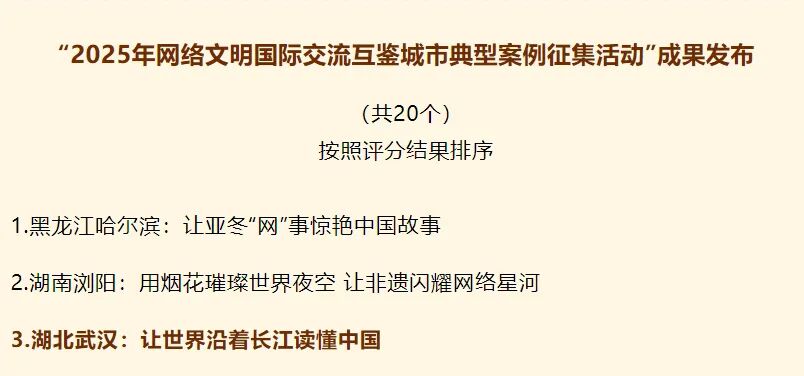 11日举行的网络文明国际交流互鉴分论坛上发布了2025网络文明国际交流互鉴城市典型案例、“网上蒲公英”典型案例以及“数字中国的机遇”系列短视频等三项成果。其中,湖北省武汉市的《让世界沿着长江读懂中国》入选城市典型案例;黄石广播电视台《晶晶乐道说黄石》节目主持人梁晶、湖北广播电视台主持人刘雅琛入选“网上蒲公英”典型案例。
