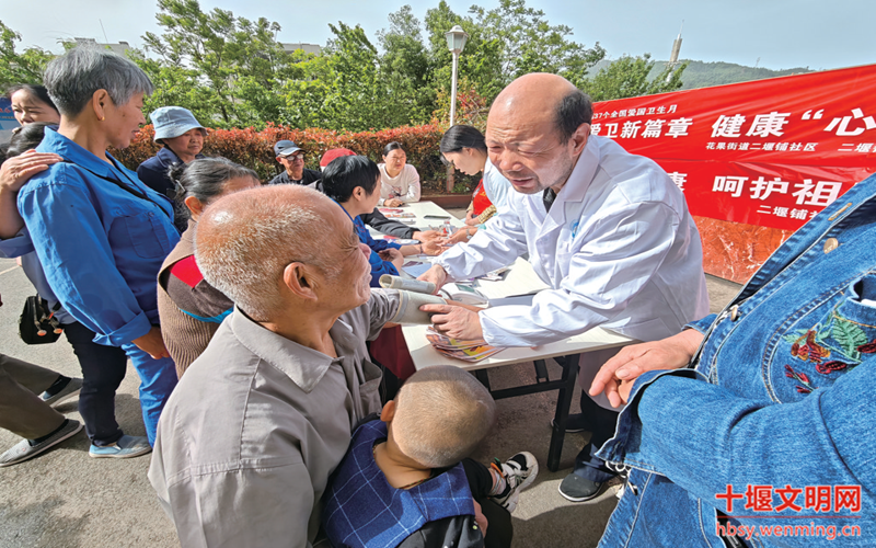 ▲张湾区花果街道二堰铺社区义诊活动现场,医务人员为居民免费量血压。
