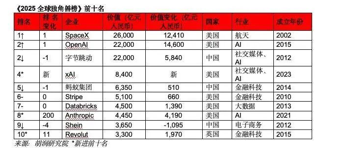 6月26日,胡润研究院发布《2025全球独角兽榜》,列出全球成立于2000年之后、价值10亿美元以上的非上市公司(榜单估值计算的截止日期为2025年1月1日)。