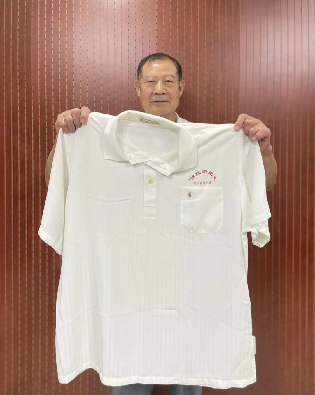 陈新洲向记者展示“98抗洪”纪念衫。澎湃新闻记者 宋昕倩 摄