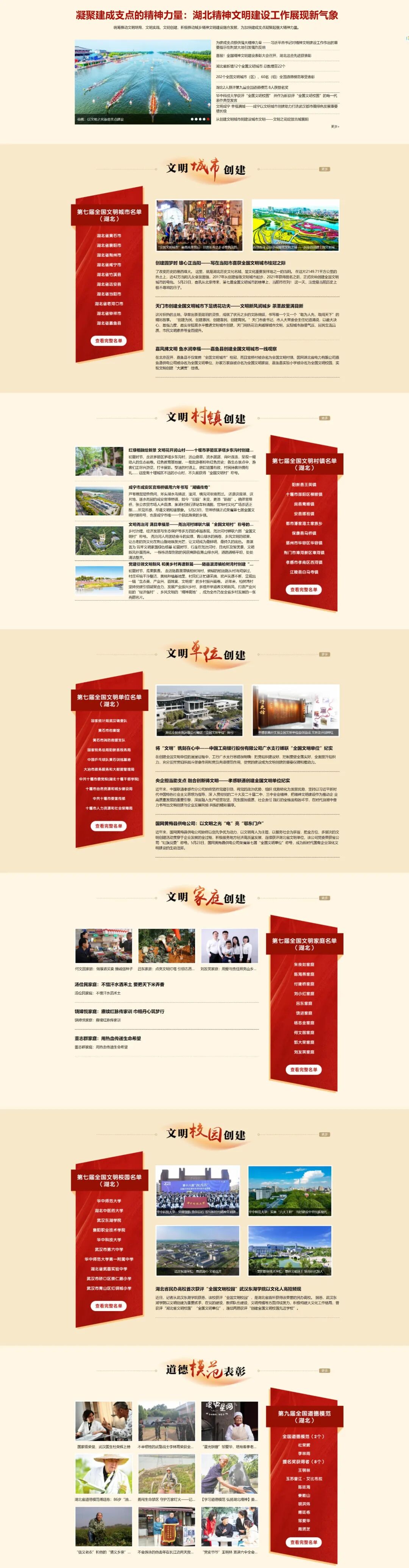 5月23日,全国精神文明建设表彰大会在北京召开,湖北省精神文明创建工作喜获丰收。黄石市、襄阳市、荆州市、咸宁市,竹溪县、远安县、当阳市、老河口市、钟祥市、嘉鱼县、仙桃市、天门市共12个城市,被授予第七届全国文明城市称号,数量排名全国第5位,获评数量超过前六届总和,我省全国文明城市数量升至22个。湖北文明网制作上线了《凝聚建成支点的精神力量》网络专题,分文明城市、文明村镇、文明单位、文明家庭、文明校园、道德模范六大版块,展示近年来湖北精神文明建设的新气象、新成绩,敬请关注!