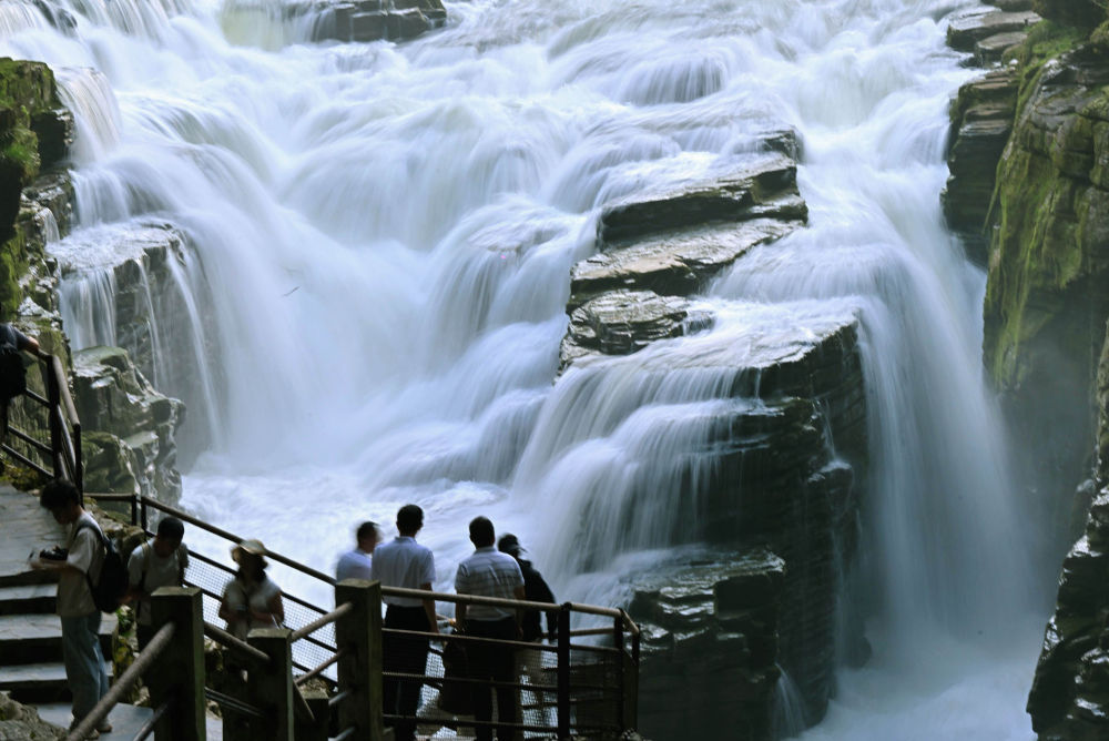 图为游客在利川市腾龙洞景区游览“卧龙吞江”自然奇观。资料照片