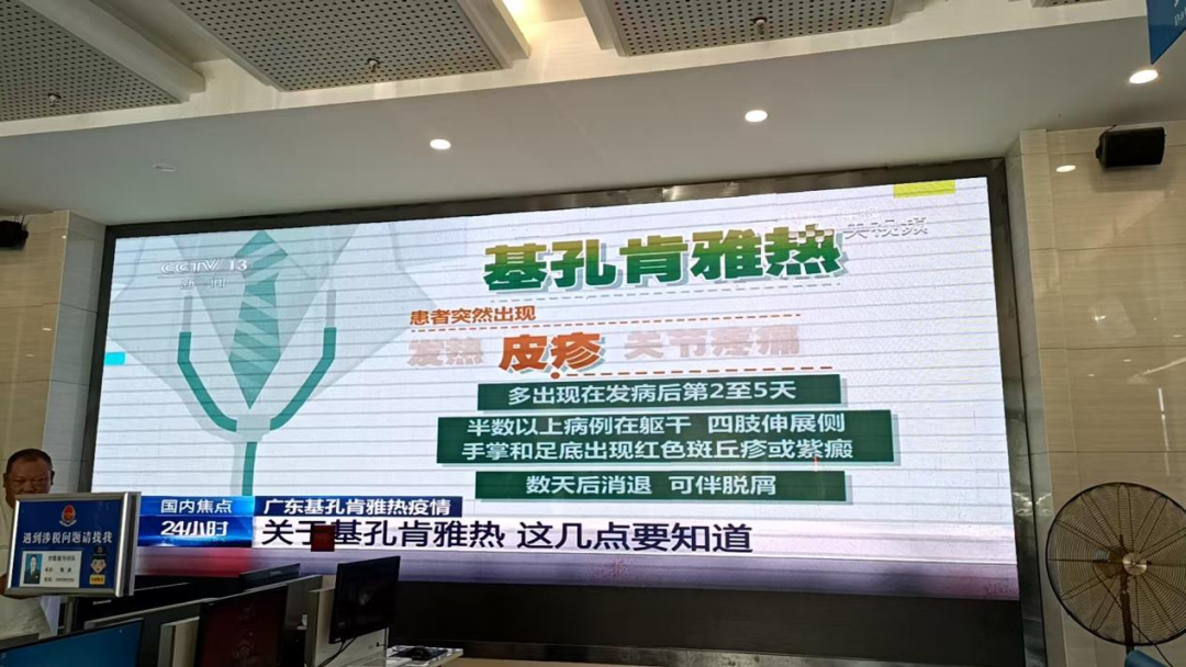 利用线下阵地和线上媒体,在政务大厅一楼的LED电子显示屏上循环播放基孔肯雅热、登革热防控指南,普及防蚊知识。在微信公众号上同步转发防控相关推文,线上线下融合推进,形成全民防控的良好氛围。