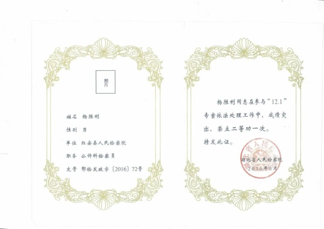 凭借扎实的业务能力和过硬的工作作风,杨胜利多次被抽调参与重大疑难案件办理。在全国扫黑除恶专项斗争中,他主动承担何某某等15人黑社会性质组织案。该案案情复杂、影响恶劣,卷宗达120余册。作为主办检察官,他日夜奋战,全面梳理证据、厘清事实,最终在法庭上有力指控,主犯被依法判处死缓,其余成员均受到严惩,该案的成功办理有效净化了社会环境。他也因此被评为红安县扫黑除恶先进个人。