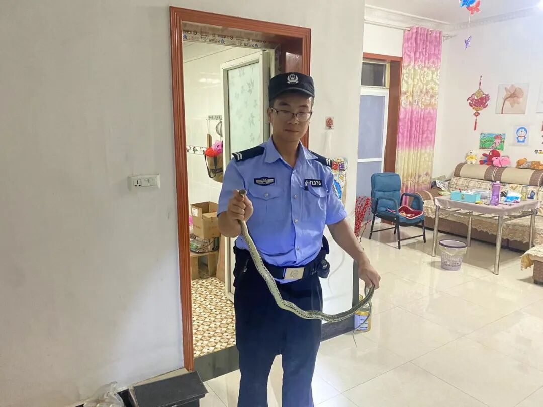 7月3日凌晨3时许,正在派出所值班备勤的孟腾辉接群众报警求助:家中出现一条大蛇,自己被吓得不敢睡觉……接警到达现场后,经过一番搜寻,发现一条长约一米的蛇,盘旋在卧室睡床下“纳凉”。他和民警迅速疏散屋内人员,瞅准时机,干净利落,将蛇捕获,并送至山林中放生。