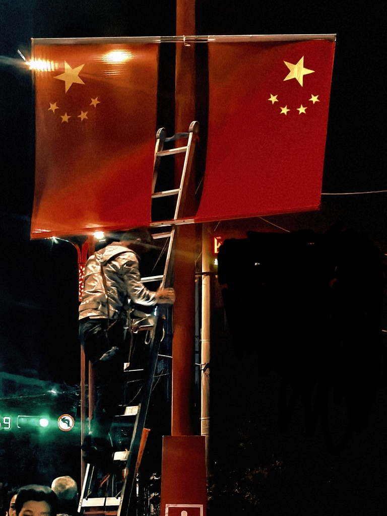 红安网消息 夜幕笼罩红安街道,工人借着微光攀爬梯子,细心悬挂起五星红旗。国旗在灯光下愈发鲜艳,似跳动的火焰,映照着街道,也映照着人们心中对祖国的深情。这一抹抹 “中国红”,是对祖国的礼赞,更是红安人心底最温暖、最坚定的牵挂,让夜晚的街道因家国情怀而格外动人。