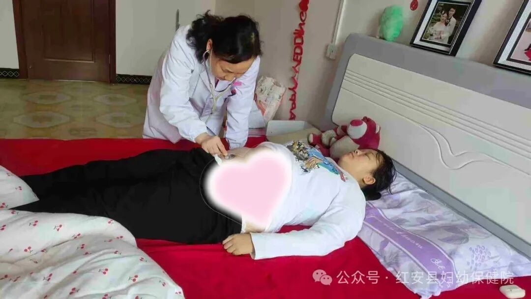 集中义诊结束后,妇产科专家前往西张家村孕妇蔡女士家,上门为其进行孕期指导和产检。