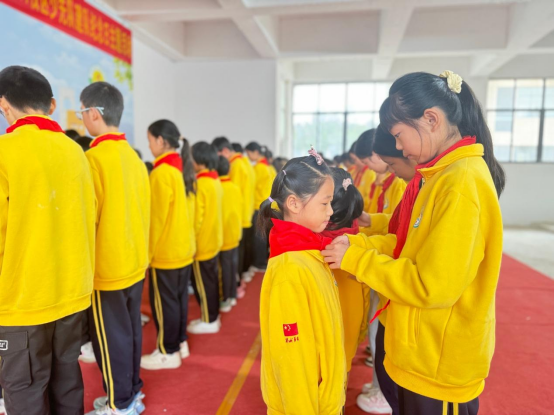 仪式在庄重而热烈的氛围中拉开帷幕。全体师生高唱国歌,嘹亮的歌声回荡在校园上空。出旗曲响起,队旗在晨风中飘扬。齐唱队歌后,由大队委代表宣读新队员名单,46名新队员依次上台,由老队员代表为他们佩戴上鲜艳的红领巾,随后新老队员互敬队礼。