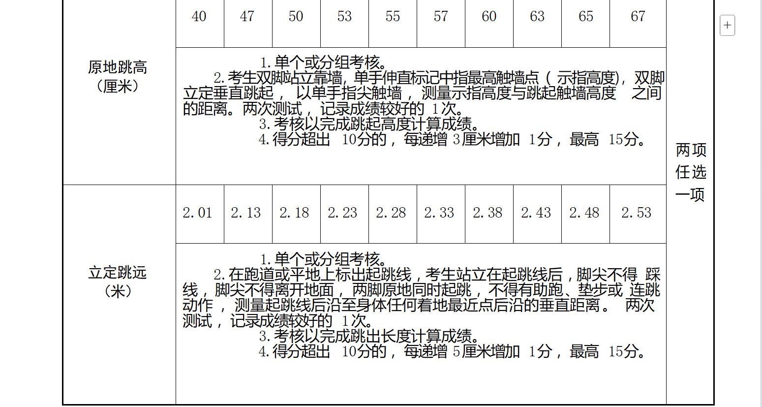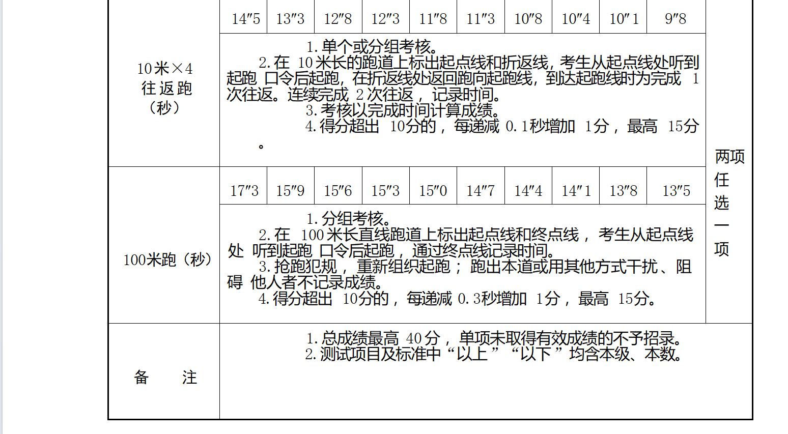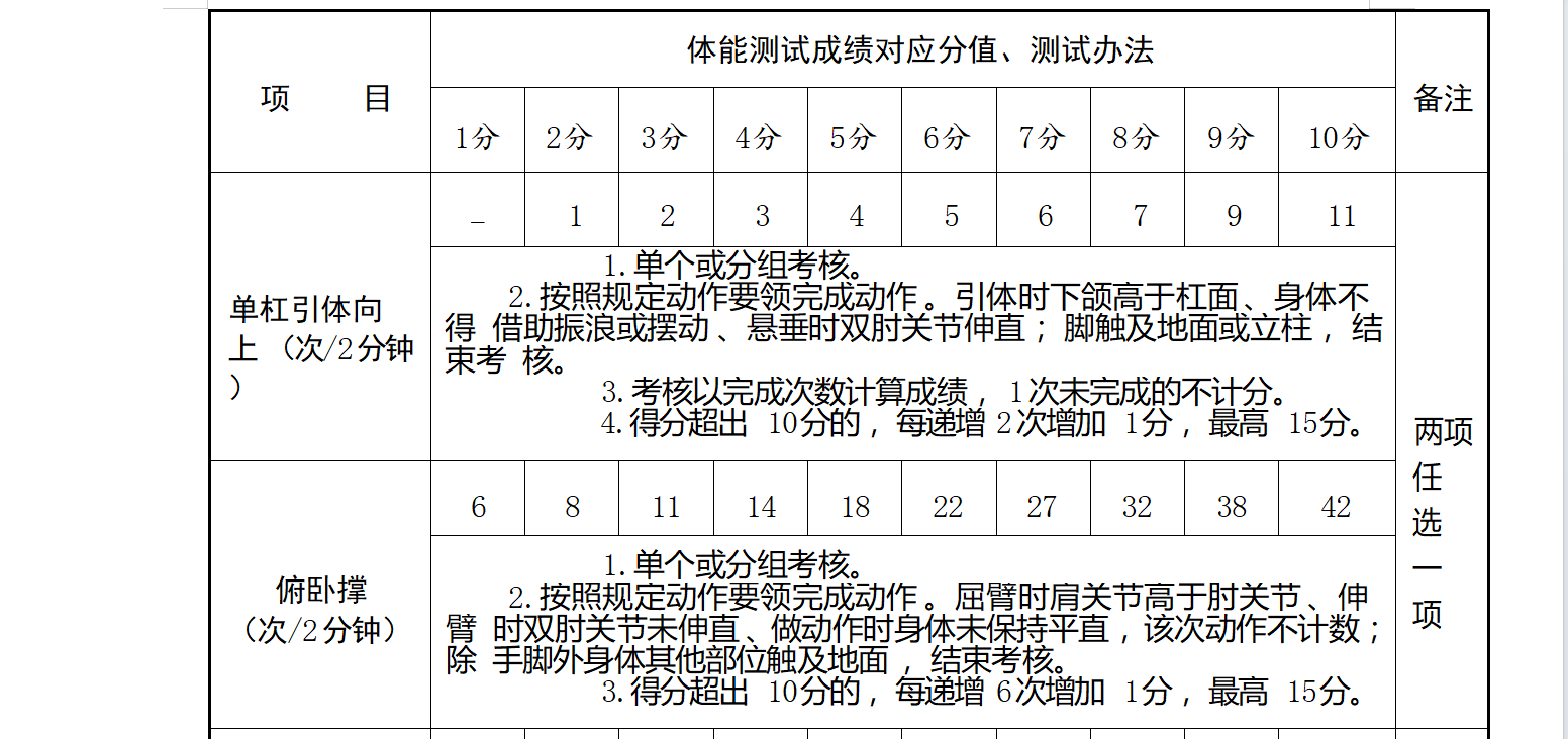 2.体能测试:统一组织实施,根据《体能测试、岗位适应性测试项目及标准》(见附件3)执行,均实行量化评分。其中:体能测试单项有效成绩为1分~15分,总成绩最高40分,任一单项未取得有效成绩的,不予录用。
