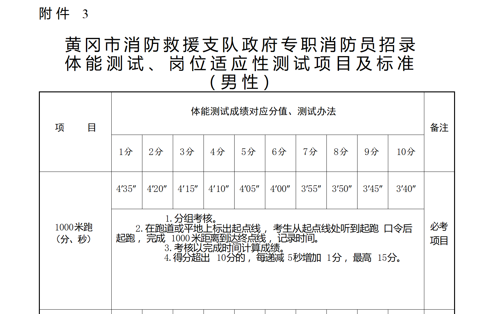 附件3 黄冈市消防救援支队政府专职消防员招录体能测试 、岗位适应性测试项目及标准(男性)