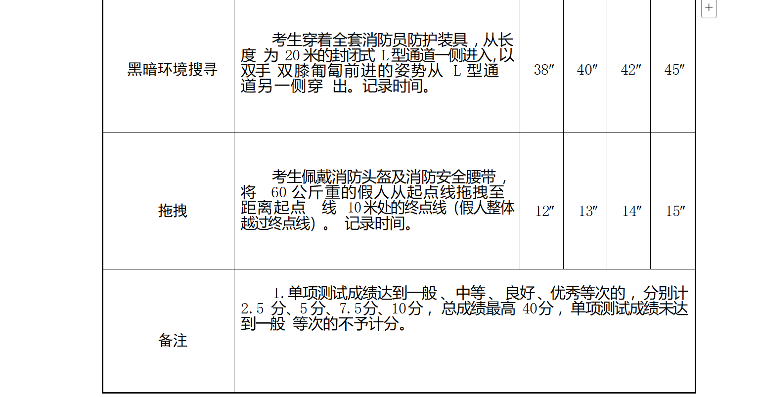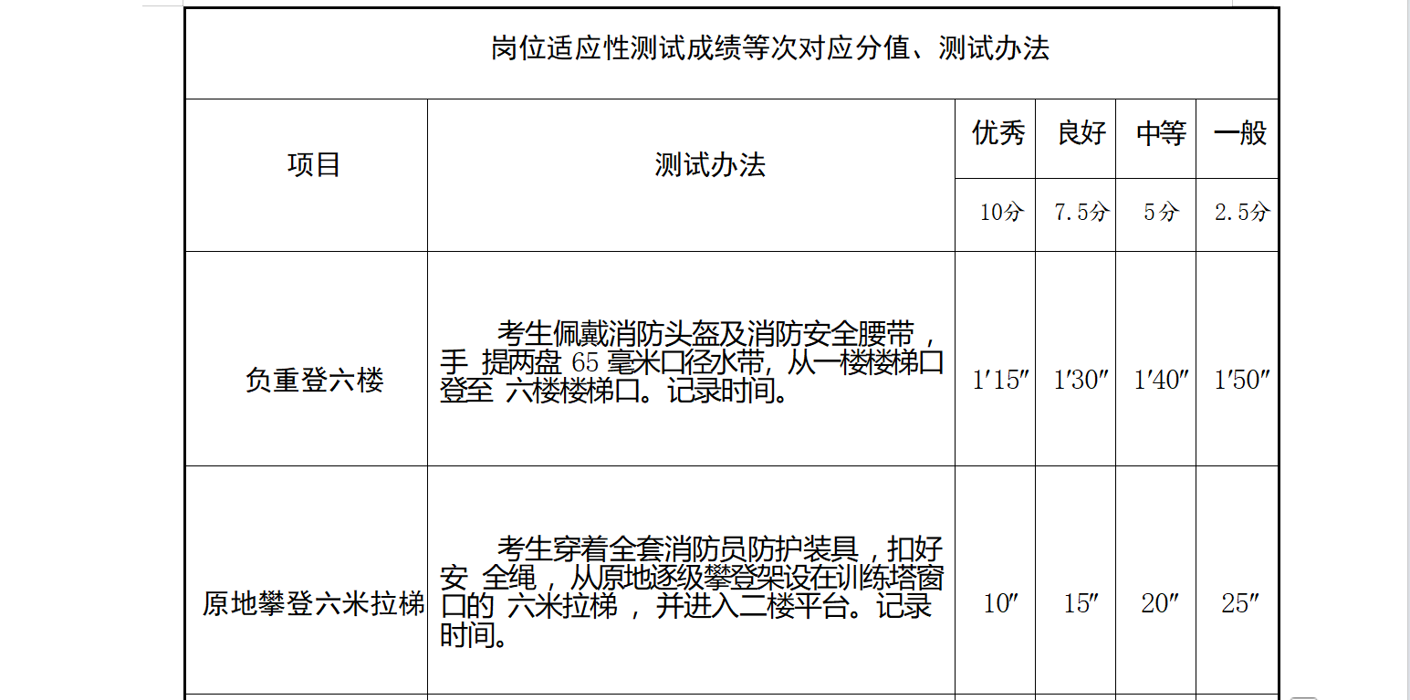 (1)灭火救援员岗位:统一组织,主要考察招录对象协调能力、空间位置感知以及对高空环境的心理适应度。共4个项目,分别为负重登六楼、原地攀登六米拉梯、黑暗环境搜寻、拖拽,其中任一单项未达到一般等次的不予录用。